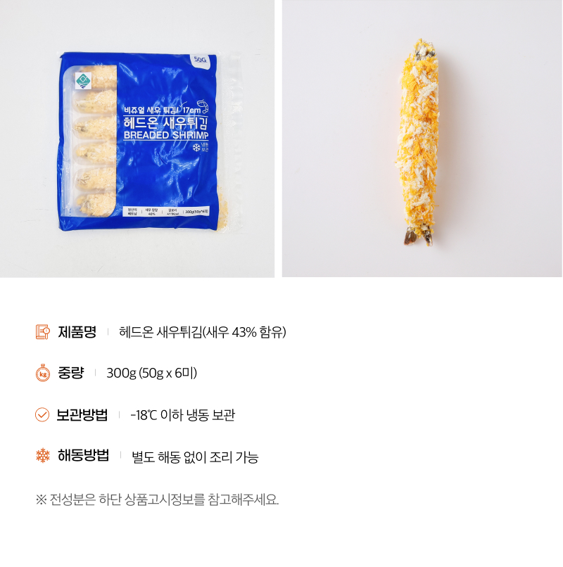 | 제품명 | 헤드온 새우튀김 (새우 43%로 함유) | ||