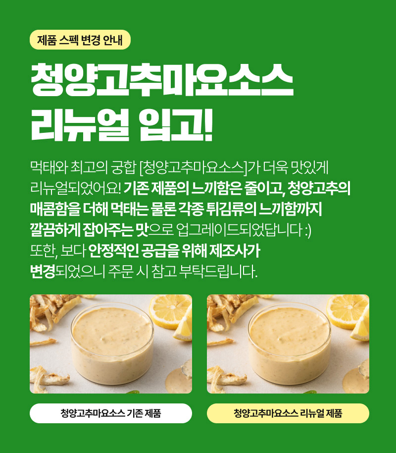 | 원재료명 및 함량 | 마요네즈 78.75%[식물성 유지(외국산), 난황액(계란:국산), 발표식초, 설탕, 정제소금], 청양고추 10%(중국산), 설탕, 양조간장[탈지대두(외국산),천일염(호주산)], 발효식초, 주정, 비타민B1염산염, 올레오레진캡시컴, 잔탄검, 메틸셀룰로스, 파라옥시안식향산에틸(보존료) | ||